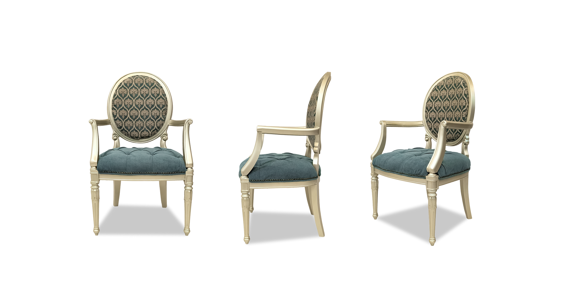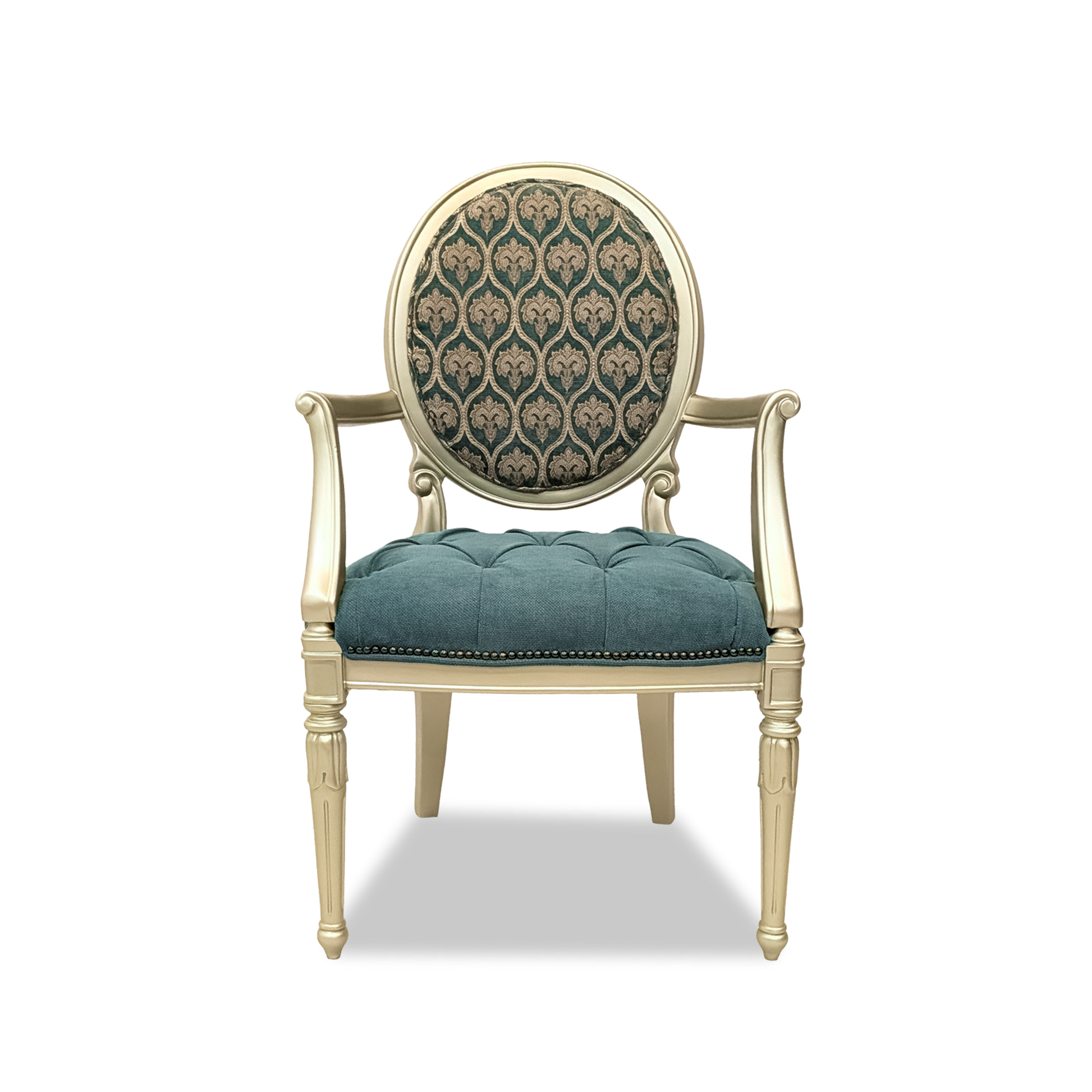 A true statement of timeless luxury, the Majesty Pearl Oval back Dining Chair is crafted from solid teak wood and finished in a refined deco polish. This classic carved wooden chair showcases a sophisticated oval backrest with elegant jacquard fabric, complemented by a plush suede seat for unmatched comfort. Hand-carved detailing on the frame and arms adds a touch of artisanal charm, making it a perfect addition to elegant dining rooms or luxurious sitting spaces that celebrate heritage and craftsmanship.
